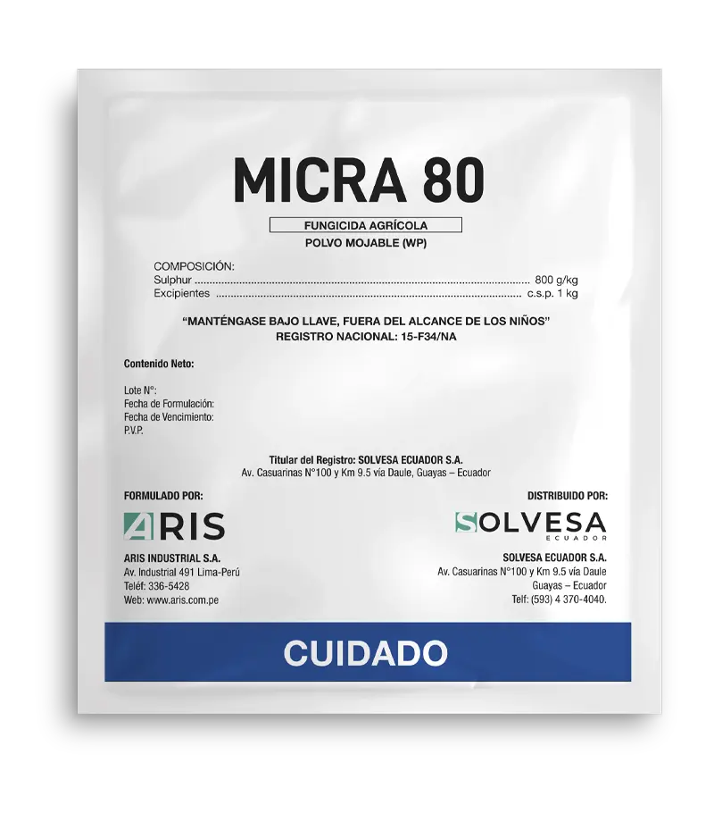 Fungicida en polvo mojable con azufre, alta dispersión en agua.